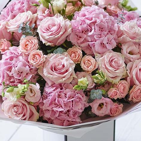 Three types of flowers, including roses, in blushing pink tones. Cute and chic.