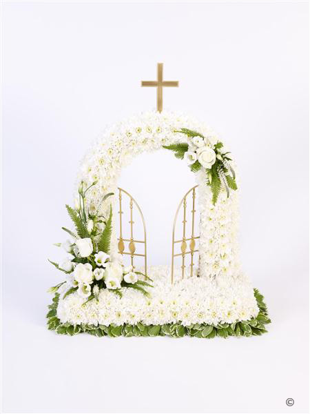 This design is created using white double spray chrysanthemums and finished with sprays of lisianthus, short Stem roses and veronica in white with contrasting green foliage.