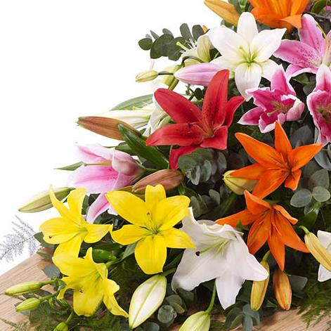 A blanket of Oriental Lily in mixed colours is beautifully complemented by an array of luxurious deep green leaves to create this simple but striking casket spray. Approximate height 122cm (4ft).