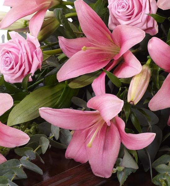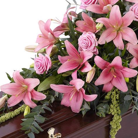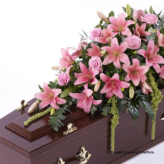 Beautiful Asiatic Lily and large-headed Rose in pretty pink are used to create this elegant casket spray. The fresh flowers are enhanced with trails of green amaranthus as well as ruscus, aralia leaves and eucalyptus. Approximate height 122cm (4ft).