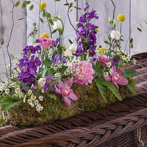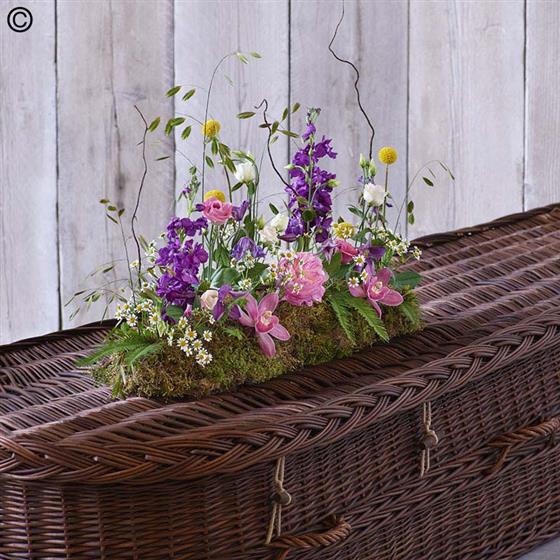 This natural looking casket spray features a beautiful array of tones and blooms including craspedia, alliums, roses and clematis. It's also made using a moss base, making it better for the environment.