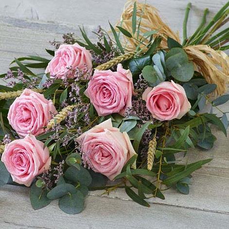 Gorgeous roses and eucalyptus beautifully combined with natural elements including dried wheat and a raffia bow.